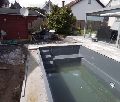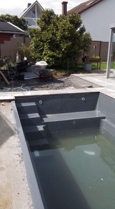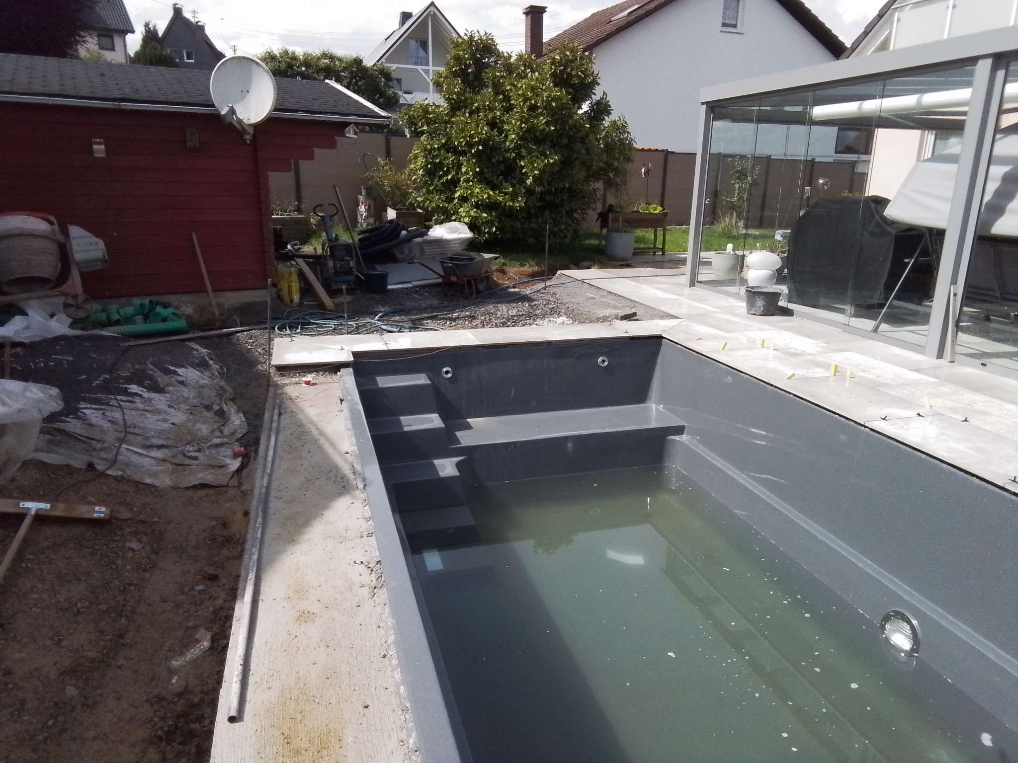 Im Sommer 2023 haben wir die Terrasse mit Keramikplatten erneuert, die anschließend in Teilbereichen überdacht wurde. Zu dem Zeitpunkt war eigentlich schon der Wunsch nach einem Pool im Garten da, aber da die Gartenfläche doch eher klein ist, wurde die Idee zunächst verworfen. Aber nicht lange, denn im Herbst haben wir schon mit der Planung begonnen und Lösungen zu dem Projekt entwickelt.